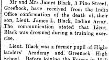 Drowned during training exercises in Karachi, attempting to help a weaker swimmer. Parents lived at 3 Pine Street. Former pupil of Highlanders Academy and Greenock High School. Had worked in Scotts accountants department
