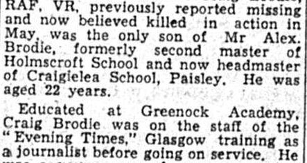 Aged 22. Only child of Alexander A L and Margaret S Brodie of 59 Finnart Street, Greenock. Son of Alex Brodie who was a teacher at holmscroft School and then headmaster at Craiglea School in Paisley. William had been training to be a journalist. He was a member of Greenock Golf Club
