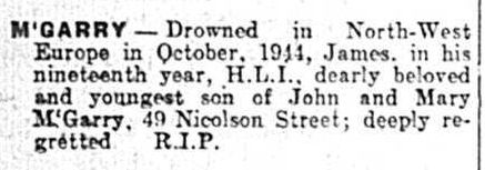 Aged 18 Son of John and Mary McGarry, of 49 Nicolson Street, Greenock, Renfrewshire. Lost at sea. Educated at St Mary's and worked for Messrs Preston, joiners