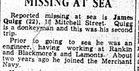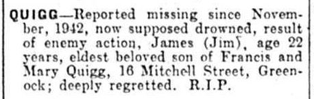 Aged 21 Son of Francis and Mary Quigg, of 16 Mitchell Street, Greenock, Renfrewshire. Engineer at Rankin & Blackmore. Educated at St Laurence's and St Columba Schools
